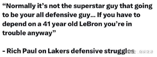 與此同時湖人現在防守問題,真的是顯而易見,著名經紀人裏奇-保羅直接開噴,認為生涯暮年的詹姆斯,被迫要當防守尖兵,簡直是非常離譜的事情。裏奇-保羅還坦言,一般情況下防守核心,不會是球隊巨星,更何況詹姆斯都41歲了,卻承擔大量防守任務,這就更加離譜了。