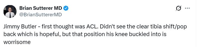 醫學專家Brian寫道:“巴特勒這次受傷,我第一反應就是前交叉韌帶出了問題。雖然沒看到明顯的脛骨移位和複位回彈的跡象,這算是個萬幸的信號,但他膝蓋彎折時的那個角度,實在讓人揪心。”