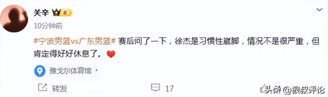 不久前,廣東體育頻道記者關辛發文報道,徐傑是習慣性崴腳,情況不是很嚴重,但肯定得好好休息了。
