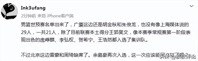 廣廈這邊還是胡金秋和朱俊龍,也沒有像上海媒體說的29人,一共21人,除了目前聯賽本土得分王郭昊文,像本賽季常規賽第一階段表現出色的龐崢麟、李弘權、賀希寧、王浩然都入選了集訓隊。
