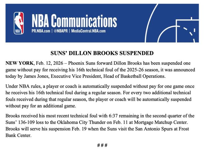 北京時間2月13日,據聯盟官方消息,太陽前鋒狄龍-布魯克斯因領到個人本賽季第16次技術犯規,被處以禁賽一場、無薪處罰。狄龍將損失121,403美元的薪水。這筆錢是他21,124,110美元年薪的1/174。太陽隊將獲得50%的薪資稅差額抵免。
