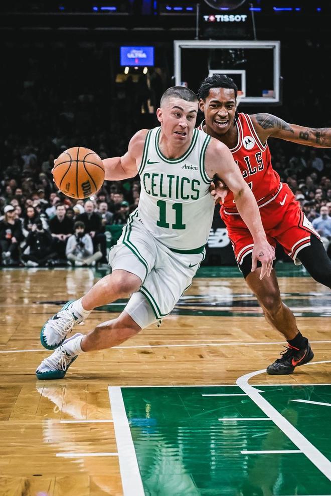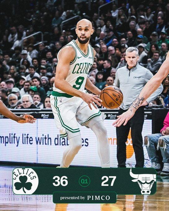 凱爾特人上一場主場89-111輸給尼克斯,公牛過去5場遭遇5連敗,本賽季前兩次交鋒雙方各取一勝。本場凱爾特人缺少塔圖姆,公牛缺少吉迪、奧科羅、科林斯。首節前半段雙方交替領先,纏鬥至凱爾特人17-18落後,凱爾特人連得5分反超。公牛也連得5分,布朗與普裏查德持續得分率隊反超比分,布朗7中4得到12分與普裏查德5中4得到10分,兩人均是外線命中2記三分,首節結束凱爾特人36-27領先公牛。首節公牛20中10,其中三分8中5;凱爾特人25中14,其中三分11中6。