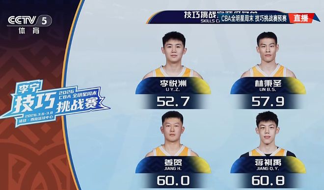 北京時間3月7日,2026年CBA全明星技巧挑戰賽預賽,8名球員經過預賽角逐,衛冕冠軍徐傑63.5秒墊底表現不理想出局,無緣衝擊第3座技巧賽冠軍。李悅洲52.7秒,林秉聖57.9秒,薑賀60秒,蔣祺禹60.8秒,4人攜手晉級決賽。
