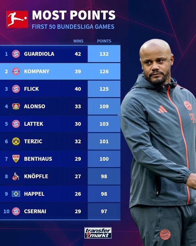拜仁主帥孔帕尼執教德甲前50場比賽拿到126分,曆史僅次於瓜迪奧拉。