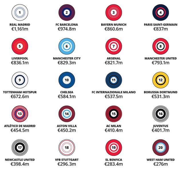 上賽季的英超冠軍利物浦位列榜單第5,該隊首次成為“金錢聯賽英超冠軍”。這主要得益於他們重返歐冠給轉播收入帶來的34%增幅,商業營收板塊也上揚7%。
