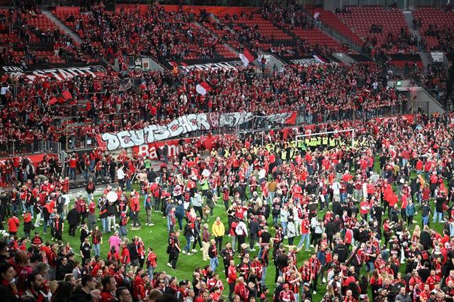 2024年4月14日,勒沃庫森隊球迷賽後湧入球場慶祝球隊奪冠。 當日,在2023-2024賽季德國足球甲級聯賽第29輪比賽中,勒沃庫森隊主場5比0戰勝雲達不來梅隊,提前鎖定本賽季德甲聯賽冠軍。這也是勒沃庫森隊曆史上首個德甲冠軍。 新華社發(烏爾裏希·胡夫納格爾 攝)