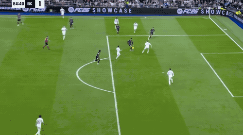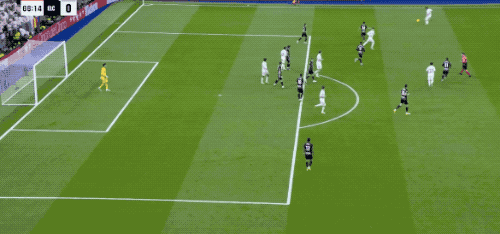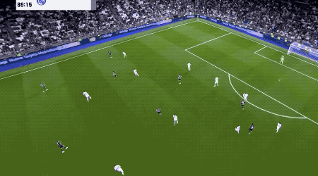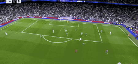 第90分鍾,剛剛替補登場的居萊爾在本方半場得球,看到門將站位靠前,他毫不猶豫直接起腳吊射。皮球從半場飛越門將頭頂直入球網,皇馬4-1,伯納烏瞬間陷入瘋狂,這粒進球甚至讓人想起當年貝克漢姆的經典遠距離吊射。