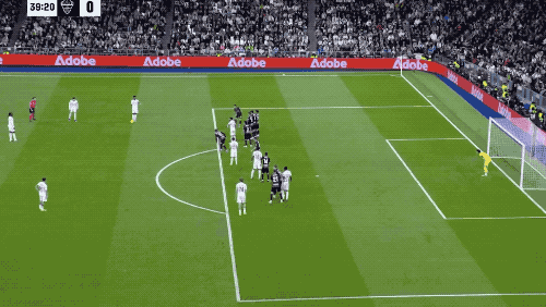 第40分鍾,威尼修斯主罰定位球橫敲,巴爾韋德遠射被門將撲出,禁區內一片混亂之中,呂迪格機敏跟進淩空掃射破門,皇馬1-0取得領先,伯納烏瞬間沸騰。